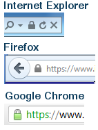Just because a webpage claims to be secure doesn't make it so. Before entering information such as credit card information or your date of birth or social security number, verify that the webpage is in fact encrypted by looking for the lock symbol located on or around the address bar. If it is not there the page is not encrypted. See the examples at the right.